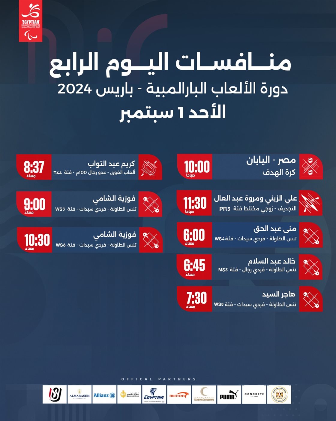 يشهد اليوم الأحد، منافسات قوية في اليوم الرابع من دورة الألعاب البارالمبية باريس 2024، والتي تقام في الفترة من 28 أغسطس حتى 8 سبتمبر الجاري.