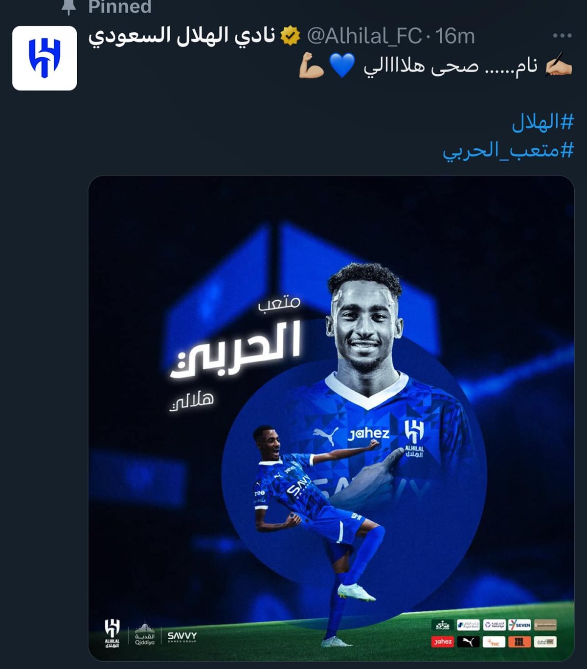 وعلق الهلال على صفقة الحربي في منشور رسمي له عبر حسابه الرسمي على مواقع التواصل الاجتماعي من خلال نشر صورة للاعب الشباب بقميص الزعيم وكتب عليها: "نام.. صحى هلالي".