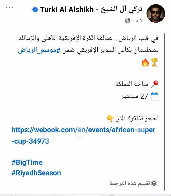 وأعلن تركي آل الشيخ عبر حسابه الشخصي بموقع التواصل الاجتماعي، قائلًا: "في قلب الرياض.. عمالقة الكرة الإفريقية الأهلي والزمالك يصطدمان بكأس السوبر الإفريقي ضمن موسم الرياض ساحة المملكة 27 سبتمبر".