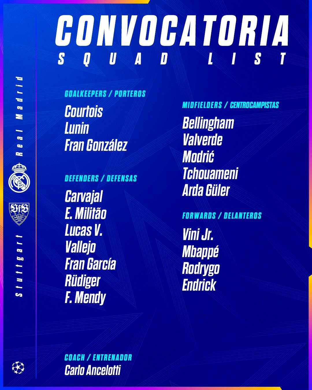 وشهدت قائمة ريال مدريد عودة الثنائي جود بيلينجهام وأوريلين تشواميني بعد التعافي من الإصابة، فيما تم استبعاد الرباعي المصاب دافيد ألابا وكامافينجا وداني سيبايوس وإبراهيم دياز.