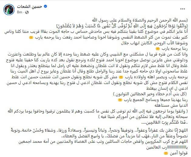 في بيانه على حسابه على "فيس بوك"، قال حسين الشحات: "بسم الله الرحمن الرحيم، والصلاة والسلام على رسول الله، {واتَّقُوا يَوْمًا تُرْجَعُونَ فِيهِ إِلَى اللهِ ثُمَّ تُوَفَّى كُلُّ نَفْسٍ مَّا كَسَبَتْ وَهُمْ لاَ يُظْلَمُونَ}".