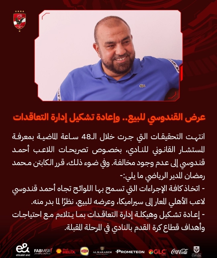 - اتخاذ كافة الإجراءات التي تسمح بها اللوائح تجاه أحمد قندوسي لاعب الأهلي المعار إلى سيراميكا، وعرضه للبيع، نظرا لما بدر منه.