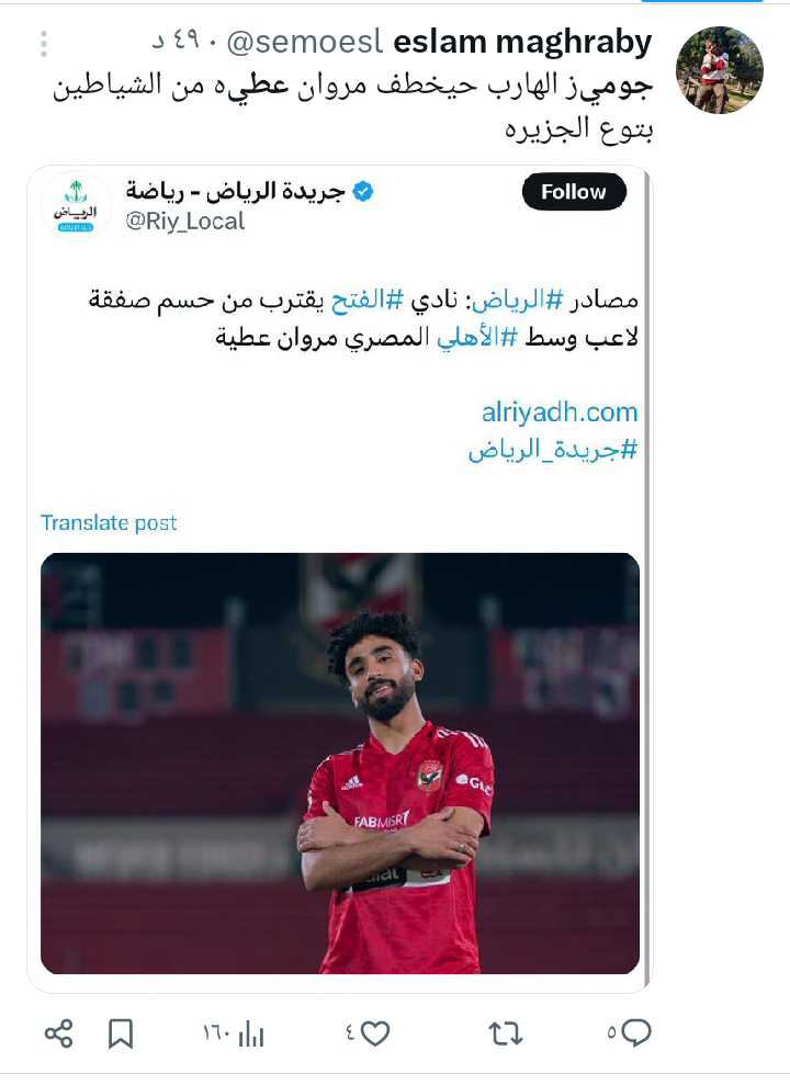وبعد تردد أنباء عن اقتراب النادي السعودي من ضم لاعب وسط الأهلي اشتعلت مواقع التواصل الإجتماعي وهاجم جماهير وعشاق القلعة الحمراء مدرب غريمهم التقليدي السابق والذي انتقل رسميا لتدريب النادي السعودي بهدف الخروج من كبوته التي يعاني منها، حيث يحتل الفريق المركز الـ 18 والأخير في جدول ترتيب الدوري السعودي برصيد 6 نقاط فقط.