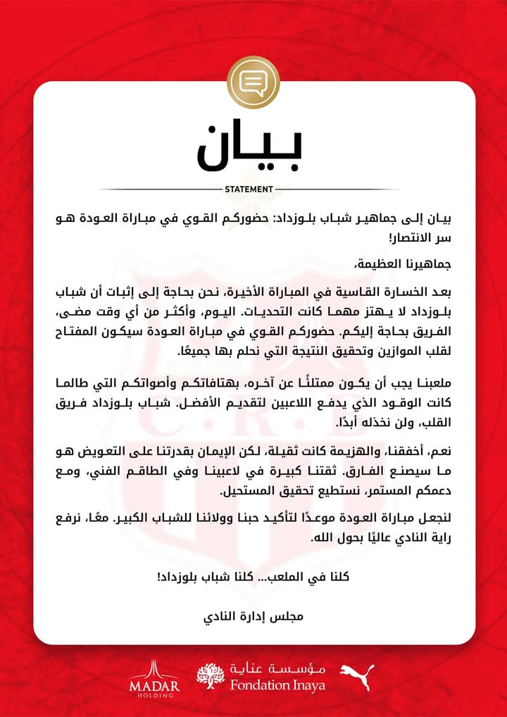 وكان قد أصدر شباب بلوزداد الجزائري بيان للجماهير الجزائرية بعد الهزيمة الثقيلة من المارد الأحمر يطالب فيه الدعم والمساندة، وجاء البيان كالآتي.
