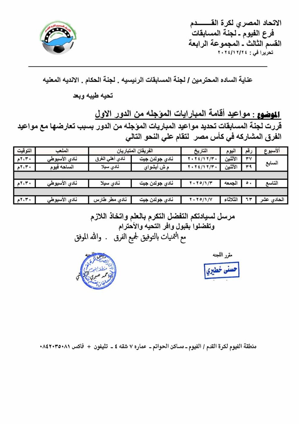 أعلنت لجنة مسابقات القسم الثالث بالمجموعة الرابعة برئاسة أحمد البكباشي ومقرها حسنى خطيرى تحديد موعد المباريات المؤجلة من الدور الأول والتى تم تأجيلها بسبب مشاركة بعض الفرق بالادوار التمهيدية بمسابقة كأس مصر.