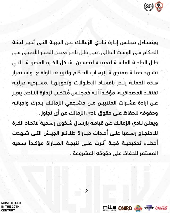 عاجل- بيان جديد من نادي الزمالك بشأن مسلسل الأخطاء التحكيمية المستمرة