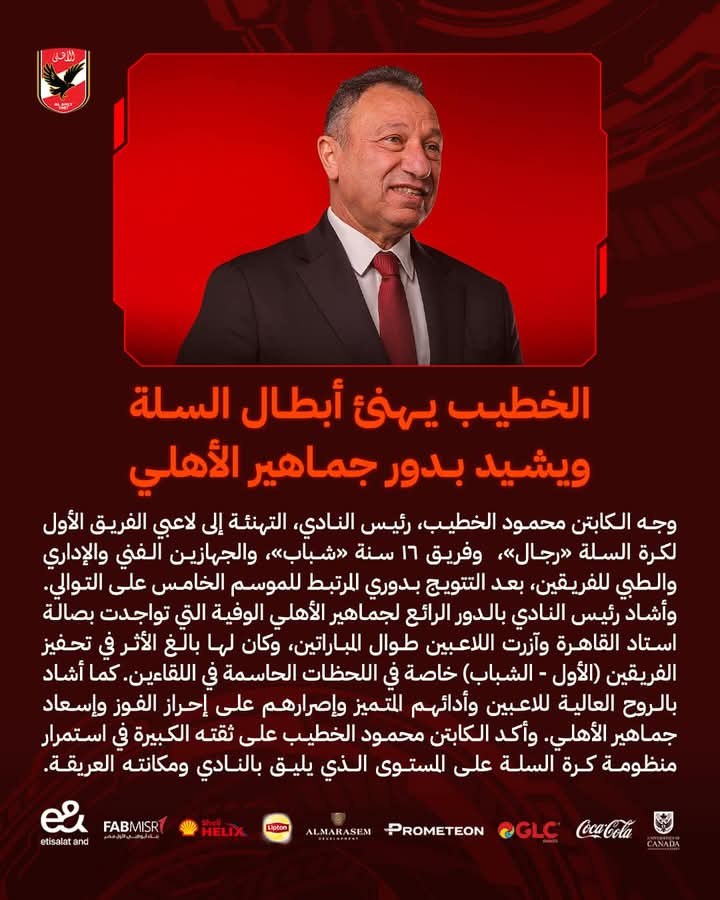 وجه الكابتن محمود الخطيب، رئيس النادي الأهلي التهنئة إلى لاعبي الفريق الأول لكرة السلة << رجال >> وفريق 16 سنة << شباب>> والجهازين الفني والإداري والطبي للفريقين، بعد التتويج بدوري المرتبط للموسم الخامس على التوالي.