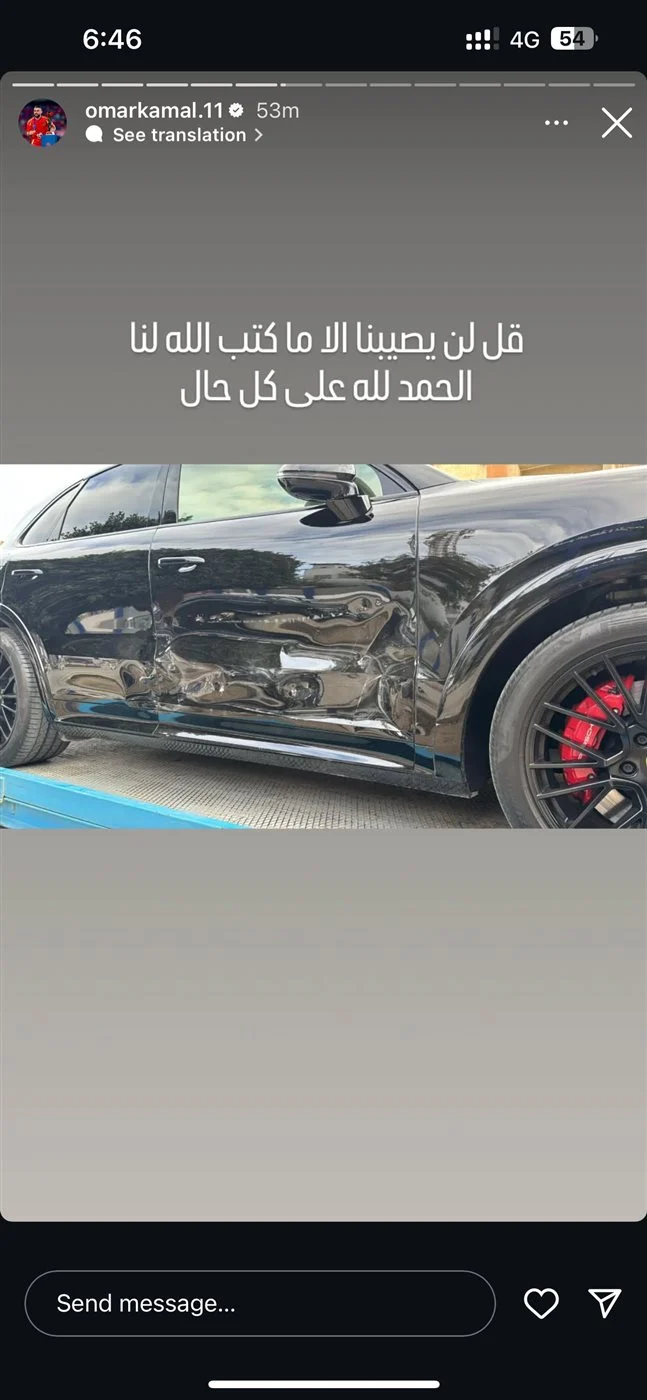 وكان عمر كمال عبد الواحد لاعب الفريق الأول لكرة القدم بالنادي الأهلي، قد تعرض لحادث سير، أدى إلى أضرار بأحد جوانب سيارته، حيث نشر عدة صور لسيارته عقب الحادث عبر حسابه على إنستجرام، وكتب عليها: “قل لن يصيبنا إلا ما كتب الله لنا، الحمد لله على كل حال”.