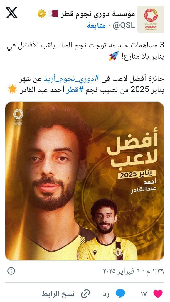 حصد النجم المصري أحمد عبد القادر، لاعب نادي قطر، جائزة أفضل لاعب في الدوري القطري عن شهر يناير، بعد أداء استثنائي قاده للتألق مع فريقه والمساهمة في تحقيق نتائج إيجابية.