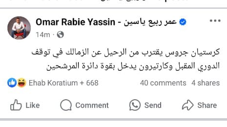 "كريستيان جروس يقترب من الرحيل عن الزمالك خلال فترة التوقف المقبلة، وكارتيرون يدخل بقوة ضمن المرشحين لخلافته."