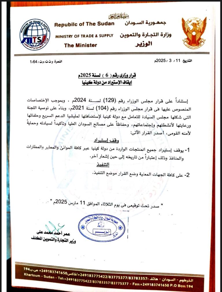 أصدرت وزارة التجارة والتموين السودانية، اليوم، قرارًا رسميًا بوقف استيراد كافة المنتجات الكينية، وذلك استنادًا إلى قرار مجلس الوزراء رقم 128 لسنة 2024. وشمل القرار حظر دخول المنتجات الكينية عبر جميع المنافذ، بما في ذلك الموانئ والمعابر والمطارات.