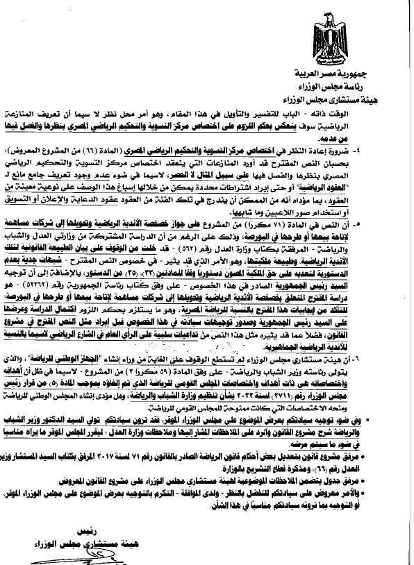 القانون الذي تم عرضه على مجلس الوزراء ومجلس النواب لاعتماده رسميًا واجه رفضًا قاطعًا من مستشاري مجلس الوزراء، الذين اعتبروا أن القانون يحتوي على عوار قانوني كبير ويمثل مخالفة واضحة للميثاق الأولمبي، الذي يحرّم التدخل الحكومي في الشؤون الرياضية.