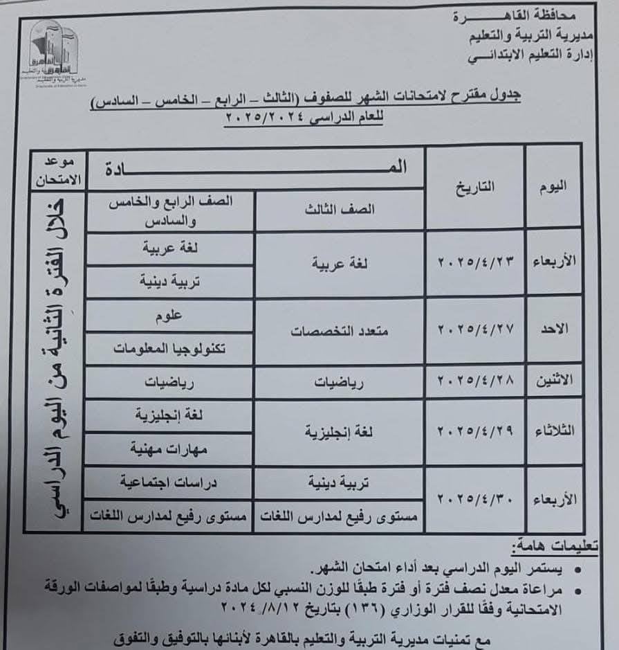 يأتي تنظيم هذا الجدول وفقًا لتوجيهات وزارة التربية والتعليم التي شددت على الالتزام بالمواعيد المحددة ومراعاة الفروق الفردية بين الطلاب من حيث التحصيل والاستعداد، لضمان مرور فترة الامتحانات في أجواء يسودها الانضباط والهدوء، تمهيدًا لختام الفصل الدراسي الثاني بشكل ناجح.