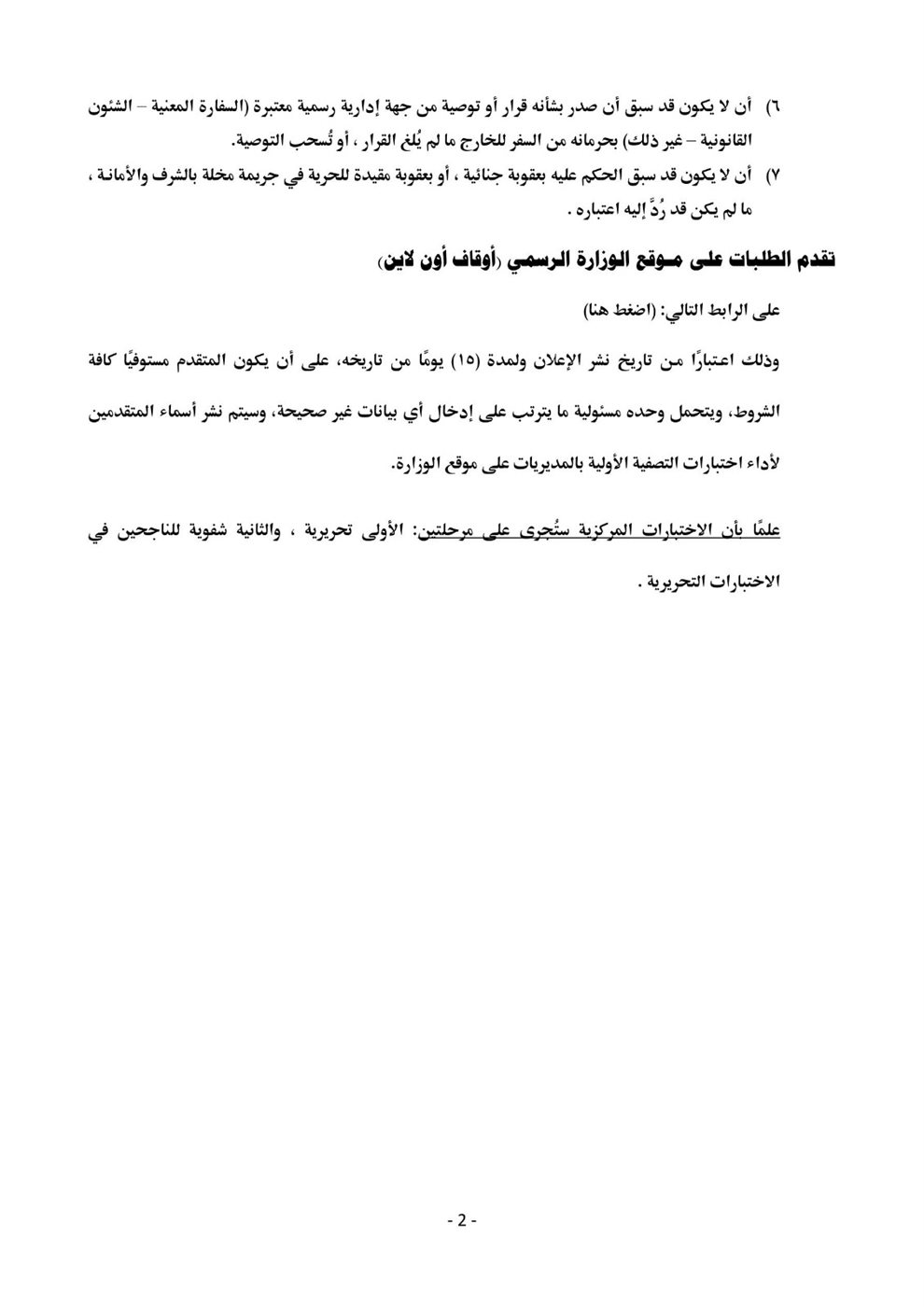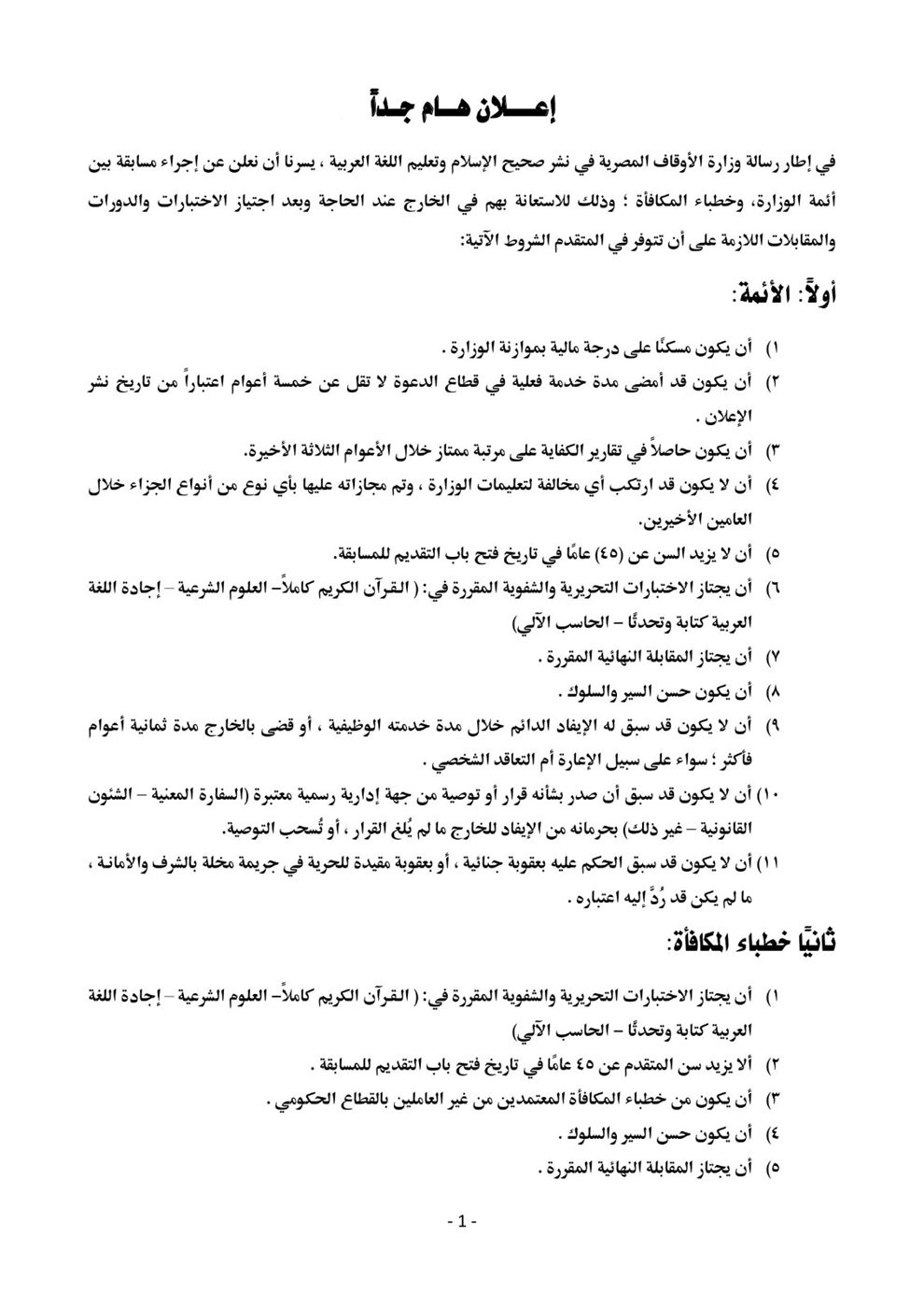 واشترطت الوزارة كذلك ألا يكون المتقدم قد ارتكب أي مخالفة لتعليماتها أُدين بسببها بأي نوع من الجزاء خلال العامين الأخيرين، وألا يزيد عمره عن 45 عامًا عند بدء التقديم، بالإضافة إلى اجتياز اختبارات تحريرية وشفوية تشمل القرآن الكريم كاملًا، والعلوم الشرعية، واللغة العربية كتابة وتحدثًا، إلى جانب مهارات الحاسب الآلي.