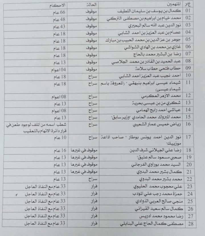وواجه المتهمون في القضية تهما تتعلق بارتكاب جرائم أبرزها "التآمر على أمن الدولة الداخلي والخارجي، وتكوين وفاق إرهابي له علاقة بالجرائم الإرهابية والانضمام إليه، وارتكاب الاعتداء المقصود به تبديل هيئة الدولة أو حمل السكان على مهاجمة بعضهم بعضا بالسلاح، وإثارة الهرج والقتل والسلب بالتراب التونسي المرتبطة بجرائم إرهابية والاضرار بالأمن الغذائي والبيئة"، وفق المصدر القضائي ذاته.