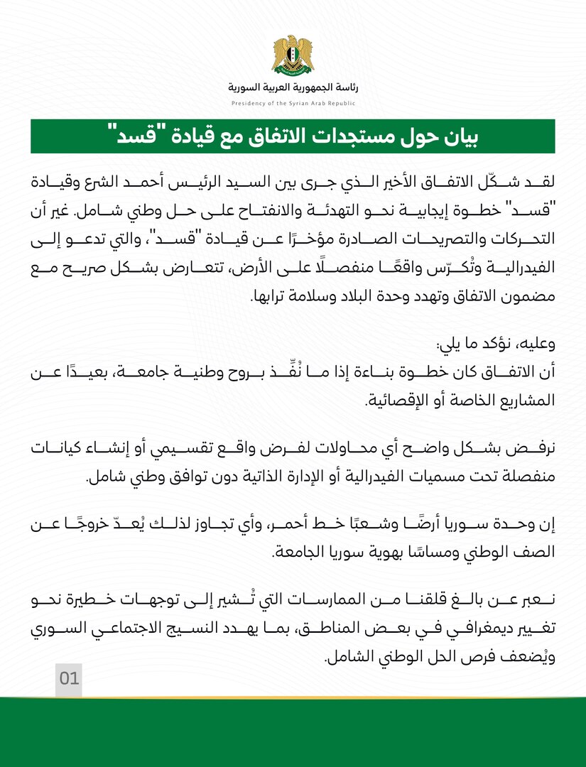 أصدرت الرئاسة السورية اليوم الأحد، بيانا بشأن مستجدات الاتفاق مع قيادة قوات سوريا الديمقراطية "قسد"، مؤكدة رفضها أي محاولات لفرض واقع تقسيمي أو إنشاء كيانات منفصلة.