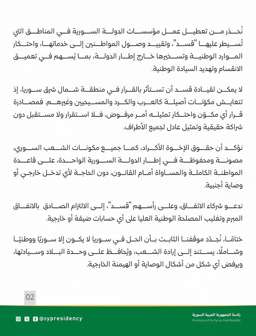 الرئاسة السورية حول الاتفاق مع "قسد": نرفض أي محاولات لفرض واقع تقسيمي أو إنشاء كيانات منفصلة