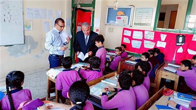 تفقد وكيل الوزارة الفصول الدراسية، وحضر حصة لغة عربية بالصف الأول الابتدائي، وحصة رياضيات بالصف الثاني الابتدائي، وناقش التلاميذ على السبورة للوقوف على المستوى العلمي، كما تابع وكيل الوزارة سجلات التقييمات.