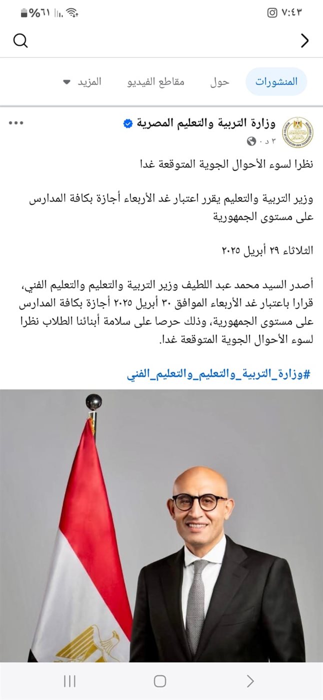 أصدر محمد عبد اللطيف وزير التربية والتعليم والتعليم الفني، قرارا باعتبار غد الأربعاء الموافق 30 أبريل 2025 إجازة بكافة المدارس على مستوى الجمهورية، وذلك حرصا على سلامة أبنائنا الطلاب نظرا لسوء الأحوال الجوية المتوقعة غدا.