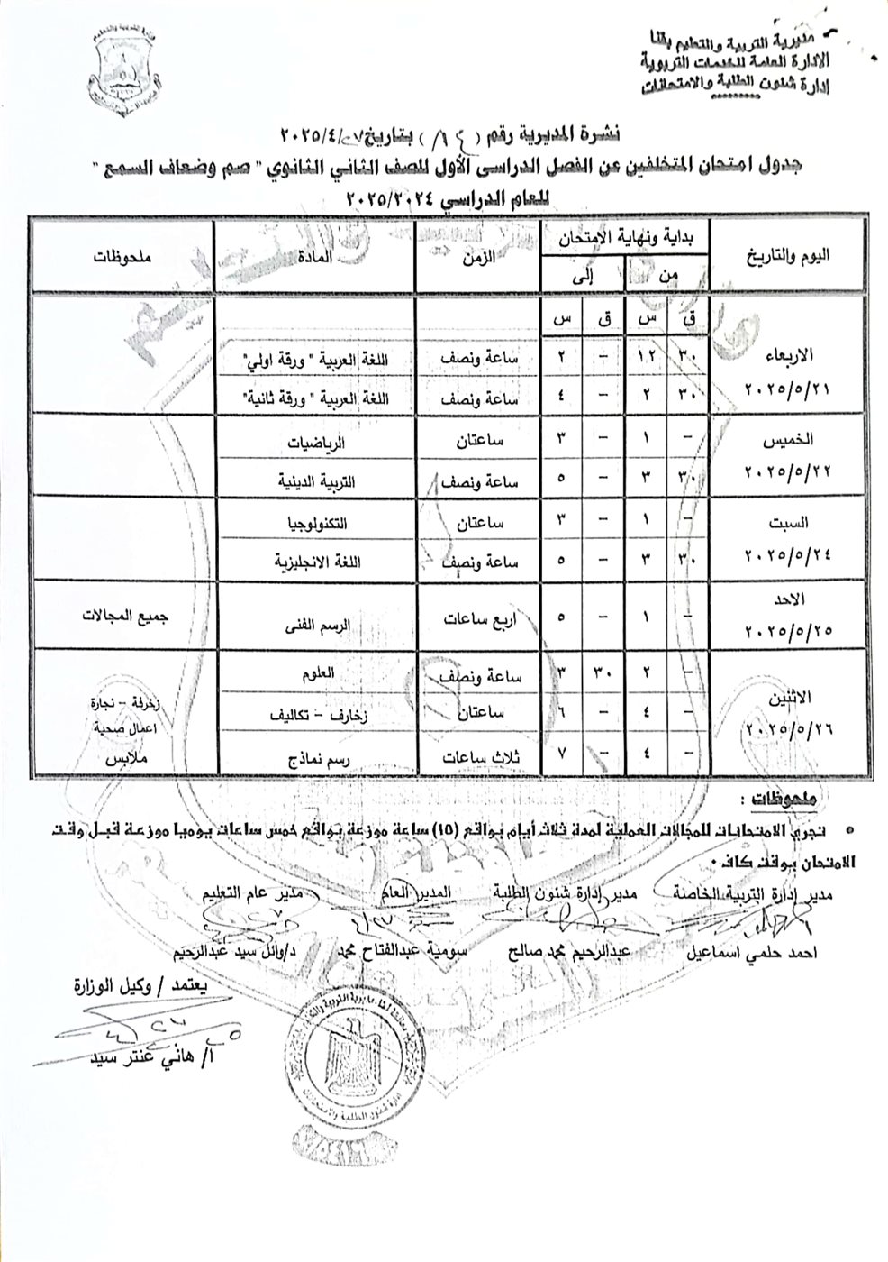 جداول امتحانات الفصل الدراسي الثاني للعام الدراسي 2024/2025 بمحافظة قنا