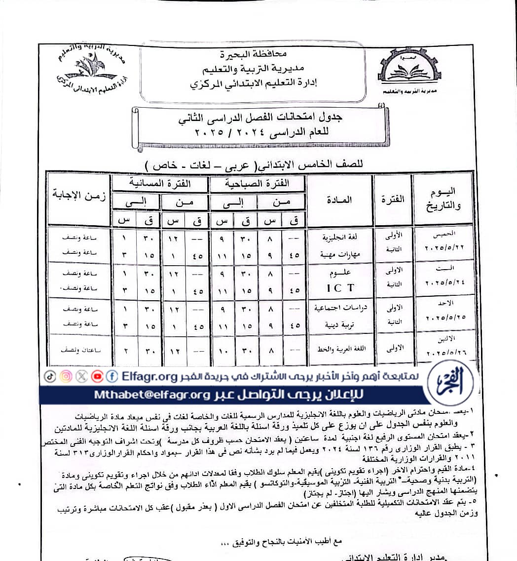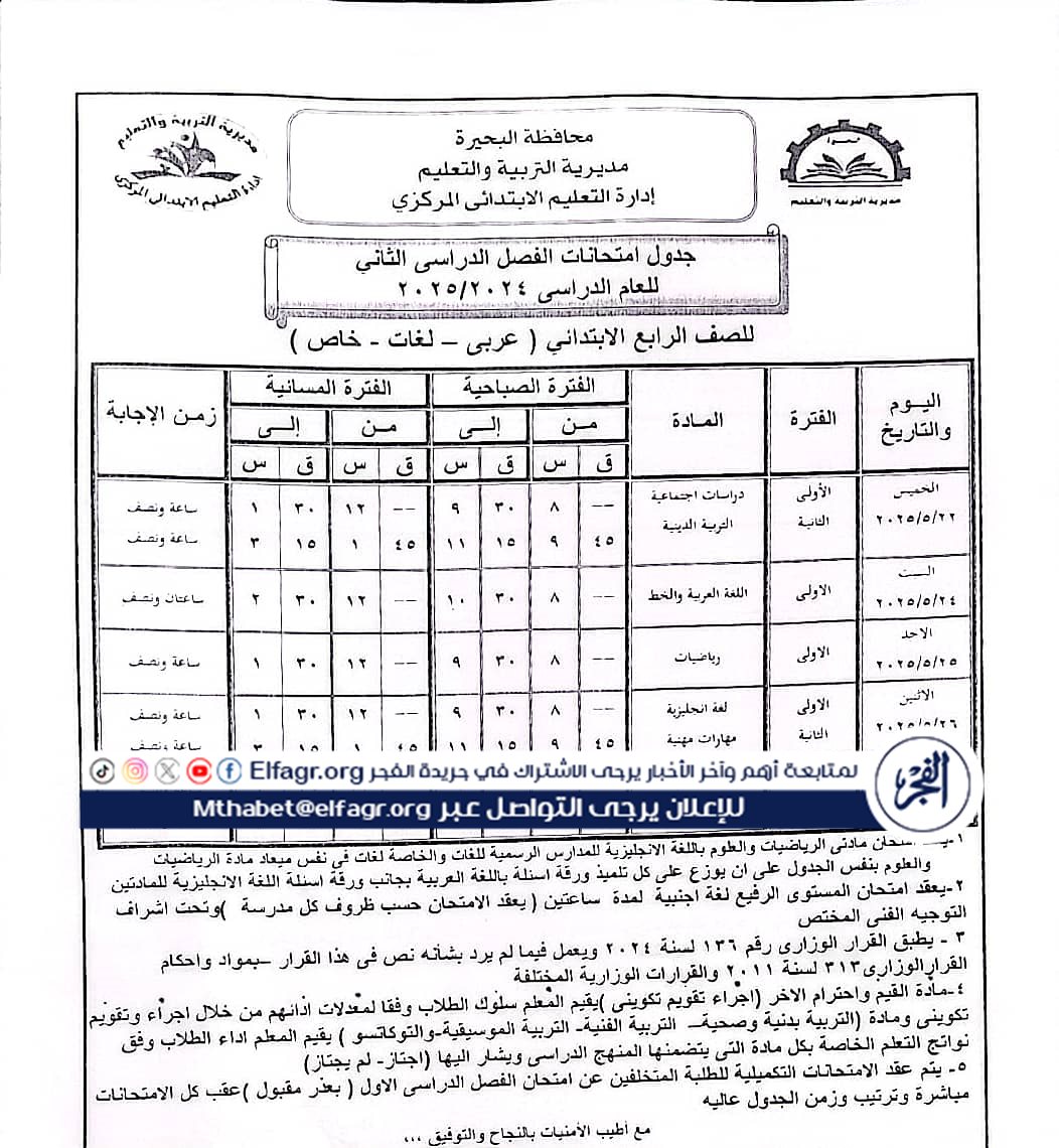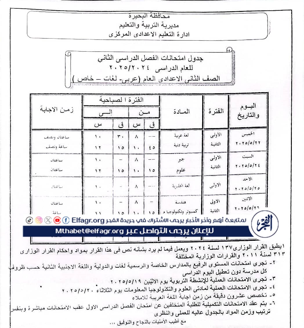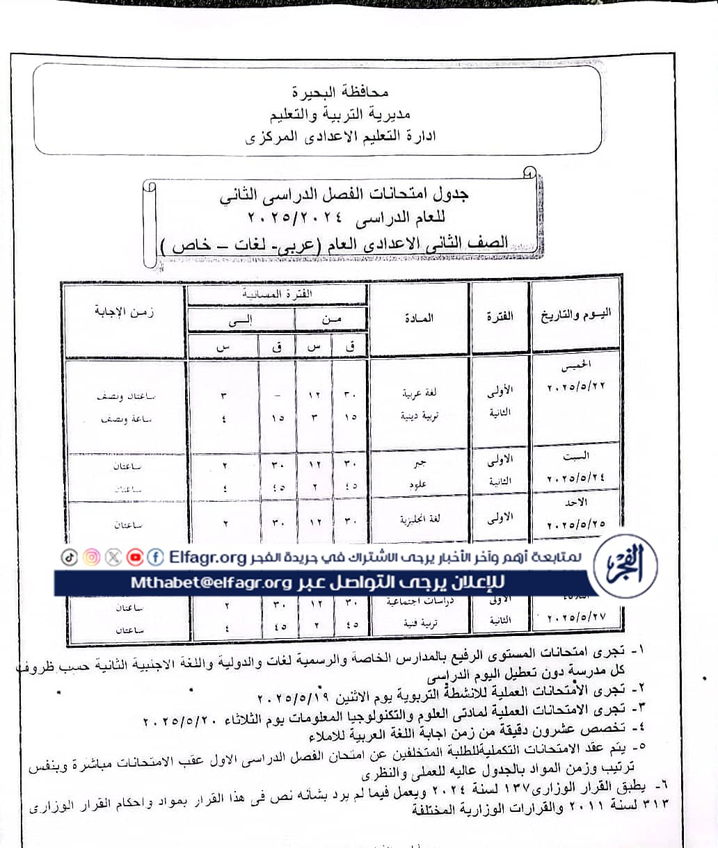 ننشر مواعيد وجداول امتحانات الفصل الدراسي الثاني لجميع المراحل التعليمية بالبحيرة