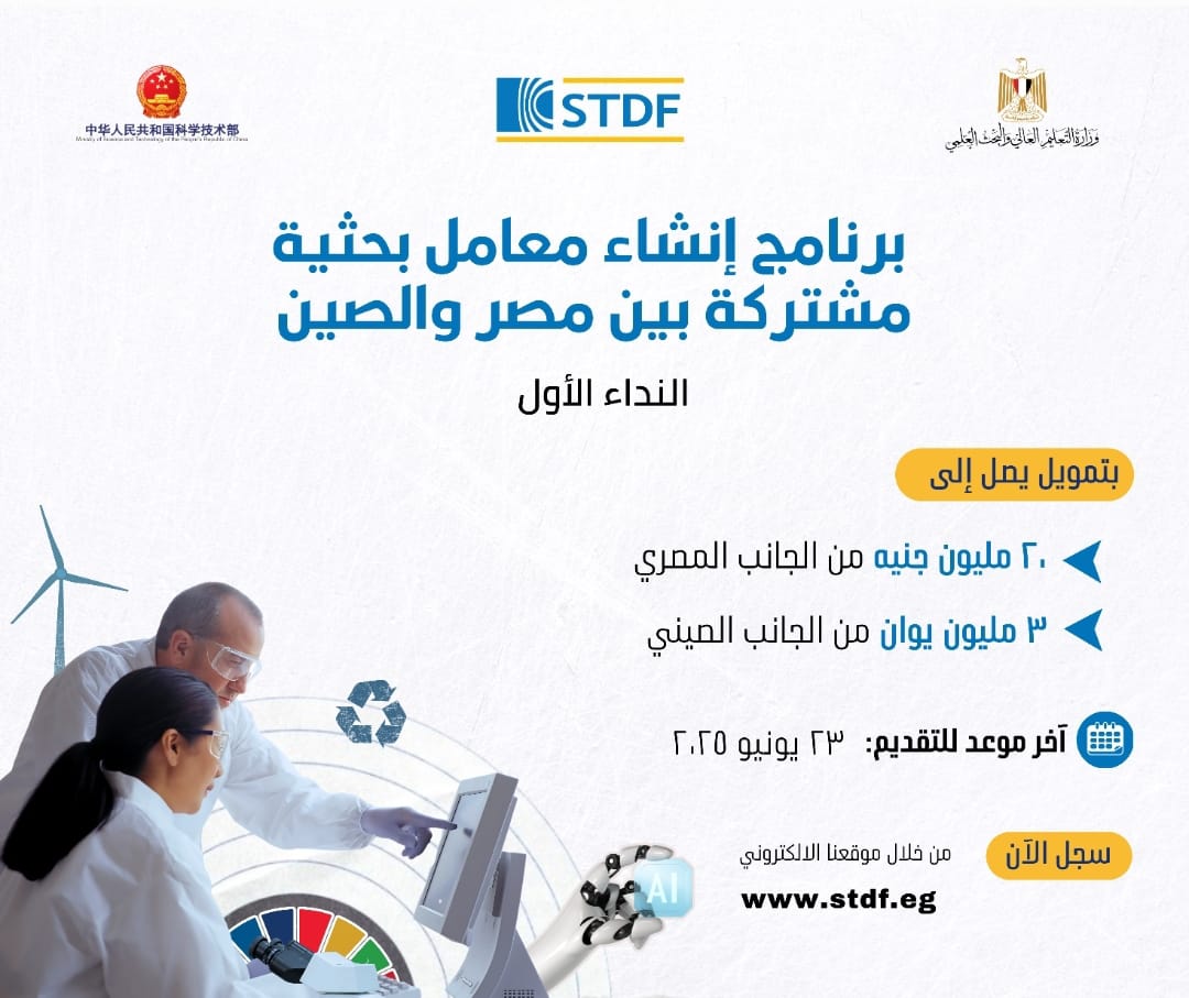 تُعلن هيئة تمويل العلوم والتكنولوجيا والابتكار (STDF)، بالتعاون مع وزارة العلوم والتكنولوجيا بجمهورية الصين الشعبية، عن فتح باب التقدم للنداء الأول لبرنامج "إنشاء معامل بحثية مشتركة بين مصر والصين"، والذي يهدف إلى تعزيز التعاون العلمي والتكنولوجي طويل الأمد بين المؤسسات البحثية في البلدين.