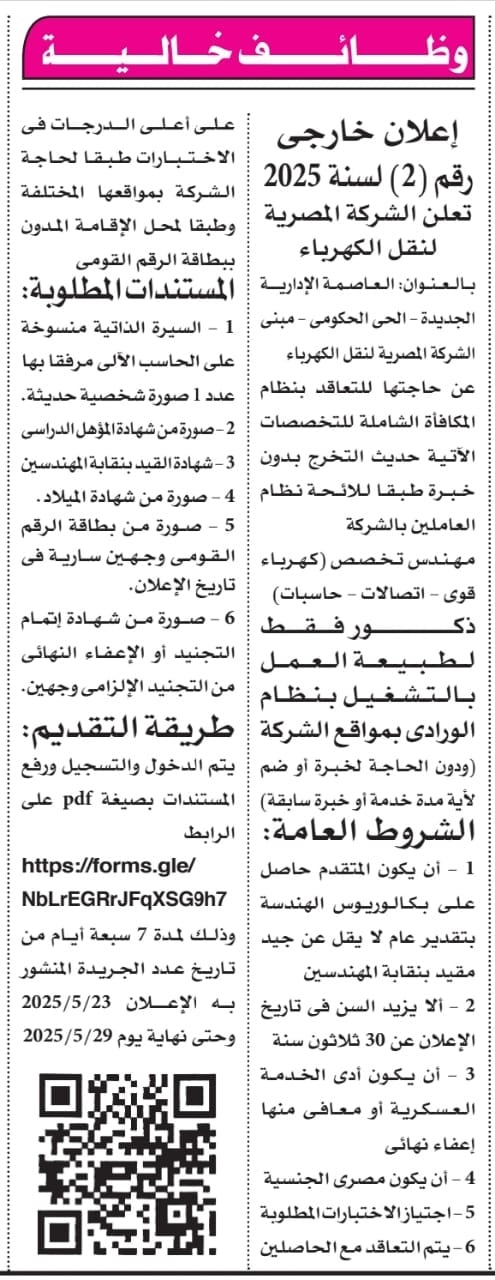 أعلنت الشركة المصرية لنقل الكهرباء أن الوظائف متاحة للمهندسين في التخصصات التالية: