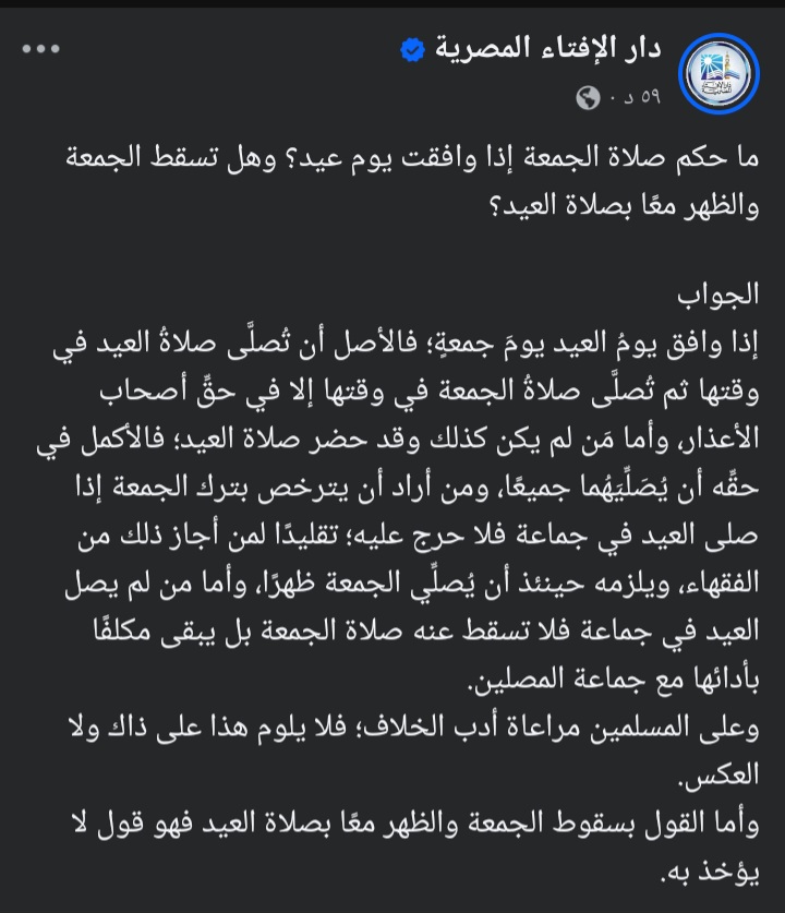 أجابت دار الإفتاء المصرية عبر صفحتها الرسميه على موقع التواصل الاجتماعي “فيس بوك” عن ما حكم صلاة الجمعة إذا وافقت يوم عيد؟ وهل تسقط الجمعة والظهر معًا بصلاة العيد؟
