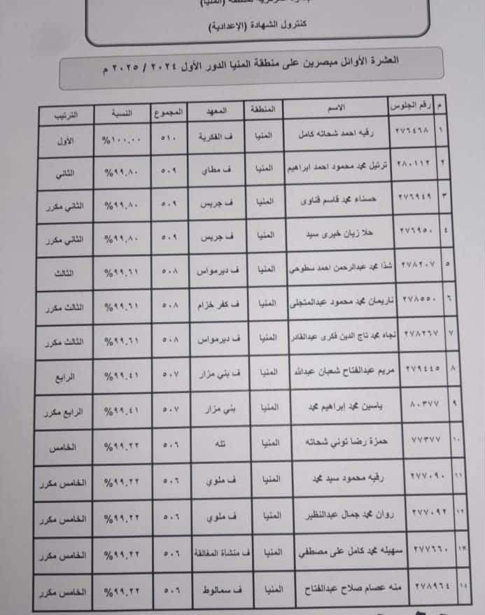 أسماء العشرة الأوائل في الشهادتين الابتدائية والإعدادية الأزهرية بالمنيا