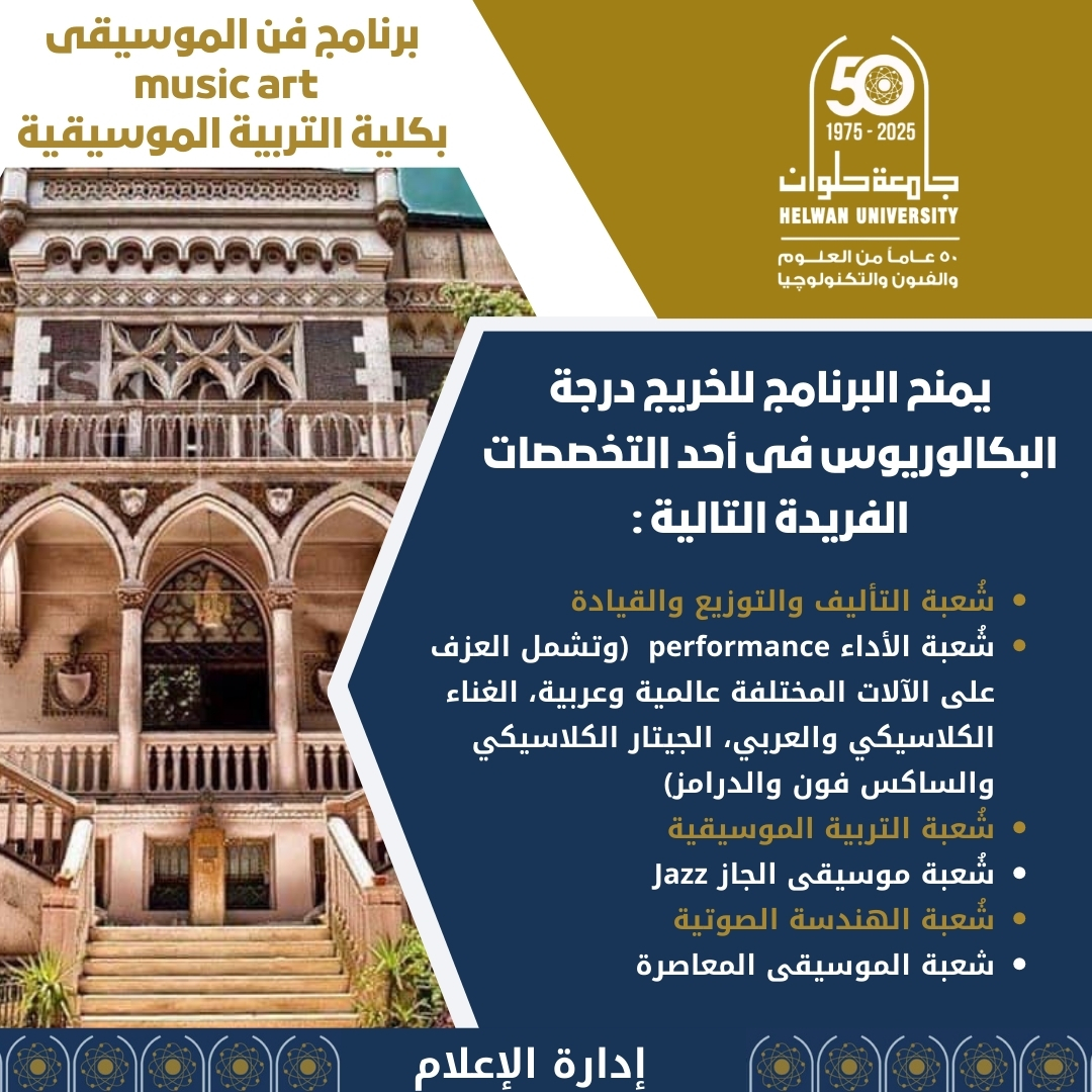 إذا كنت من عشاق الموسيقى، وتمتلك الشغف والموهبة والرغبة في التميز، فإن برنامج فن الموسيقى (Music Art) بكلية التربية الموسيقية يالزمالك – جامعة حلوان، هو اختيارك المثالي للانطلاق نحو مستقبل إبداعي احترافيم.