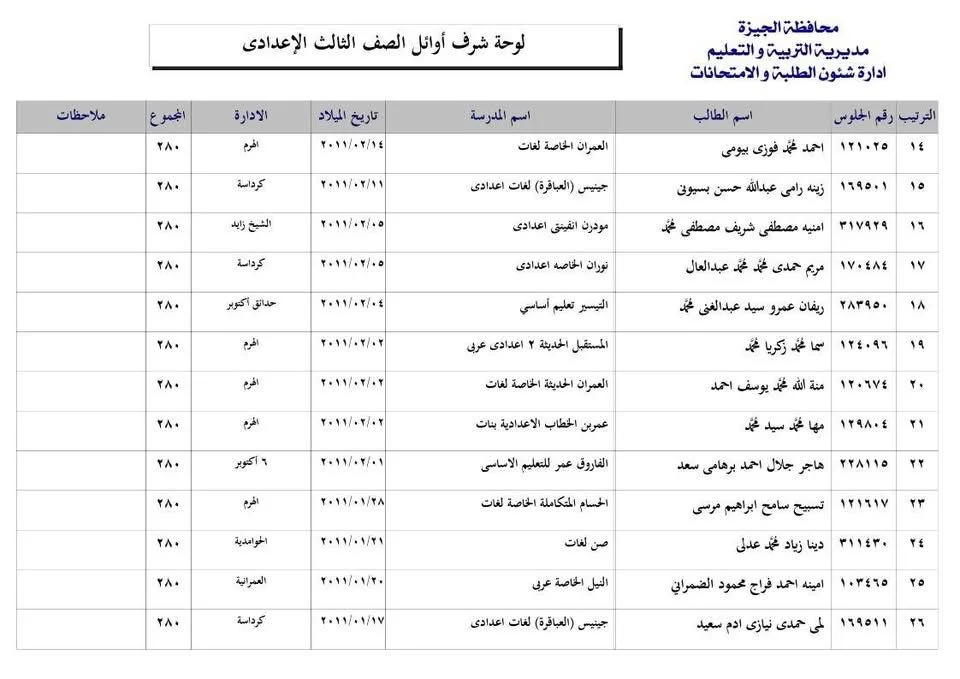 أعلنت مديرية التعليم بالجيزة عن أسماء أوائل الشهادة الإعدادية في لوحة شرف تم نشرها بصور رسمية، تضمنت أسماء الطلاب المتفوقين من مختلف الإدارات التعليمية، وسط إشادات واسعة من أولياء الأمور والمعلمين.