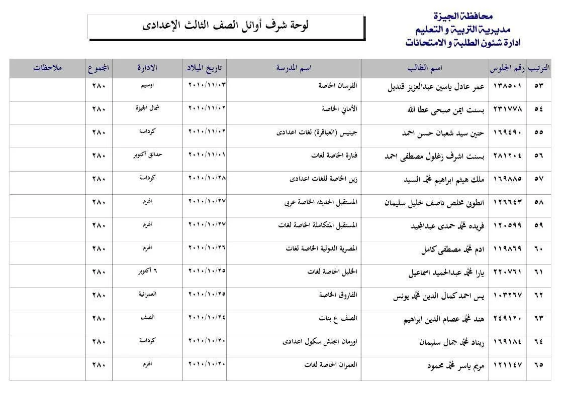 وشملت الإدارات التي حققت أعلى نسب نجاح: العجوزة، الهرم، الشيخ زايد، الصف، الدقي، الوراق، شمال الجيزة، العياط، أكتوبر، كرداسة، حدائق أكتوبر، منشأة القناطر، وأطفيح.