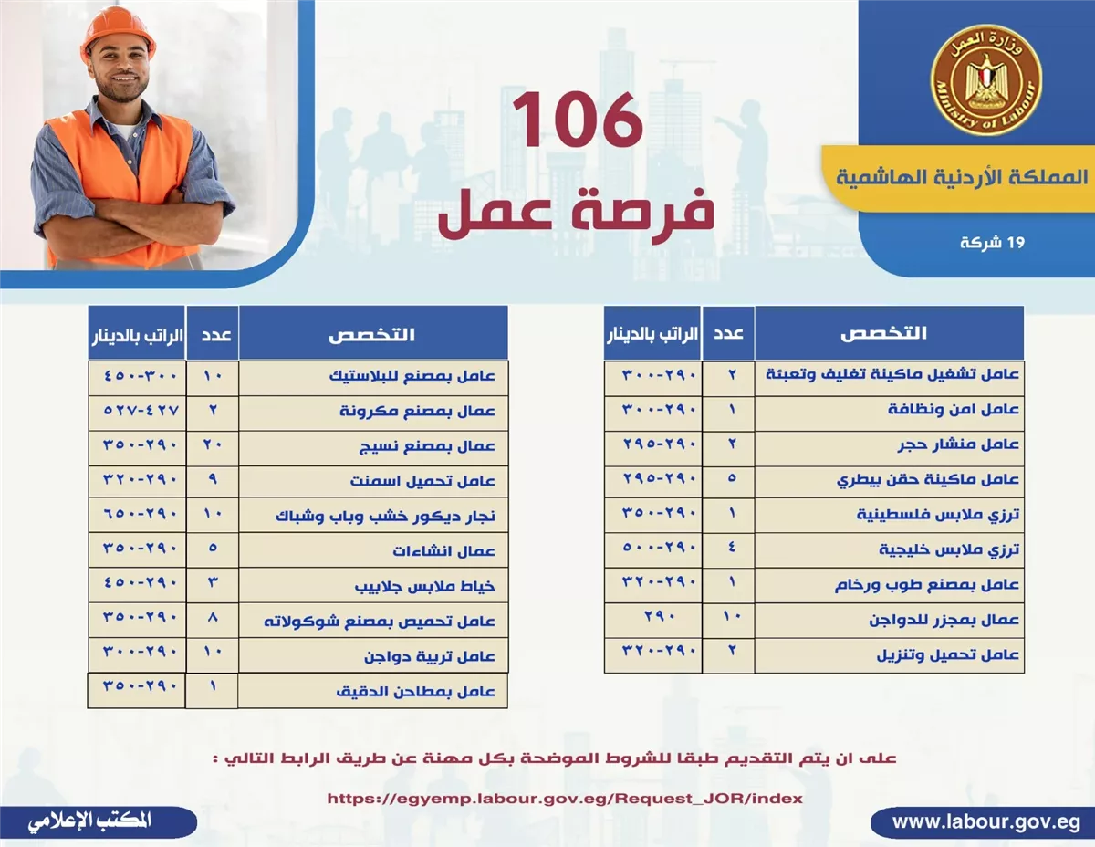 أعلنت وزارة العمل المصرية عن توفير 106 فرصة عمل في دولة الأردن، بالتعاون مع 19 شركة أردنية، وذلك في إطار جهود الوزارة لتوفير فرص عمل مناسبة للشباب المصري في الخارج، والحد من معدلات البطالة، وتعزيز التعاون الإقليمي في مجال التشغيل.