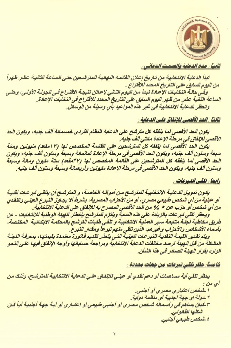 وفي حالة جولة الإعادة، تبدأ الحملة الدعائية من اليوم التالي لإعلان نتائج الجولة الأولى، وتنتهي الساعة الثانية عشرة ظهر اليوم السابق للاقتراع في الإعادة، ويُحظر الدعاية خارج تلك الفترات.