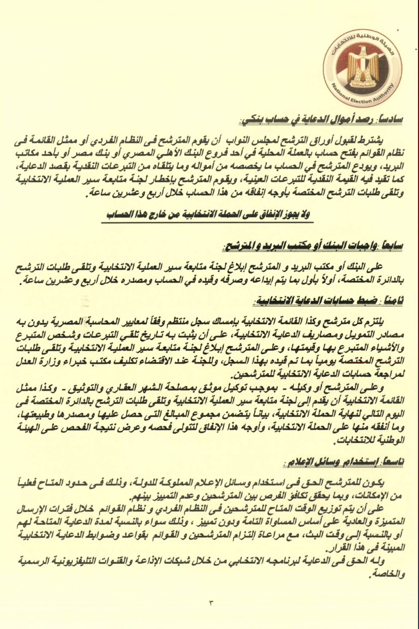 الحد الأقصى لإنفاق المترشح بالنظام الفردي هو خمسمائة ألف جنيه، ويكون الحد في الإعادة مائتي ألف جنيه.