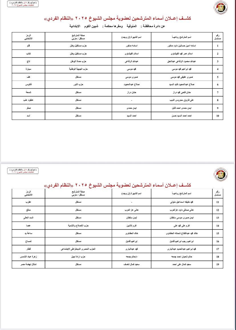 إعلان الكشوف المبدئية لمرشحي مجلس الشيوخ 2025 بمحافظة المنوفية