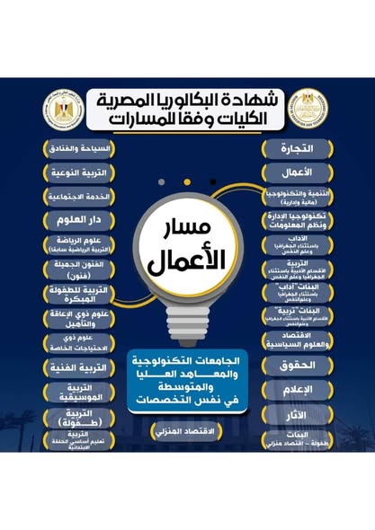 كما تم تحديد الكليات والتخصصات الجامعية المناسبة لكل مسار، وتوضيحها بشكل مرئي في صور مرفقة بالبيان، تشمل: