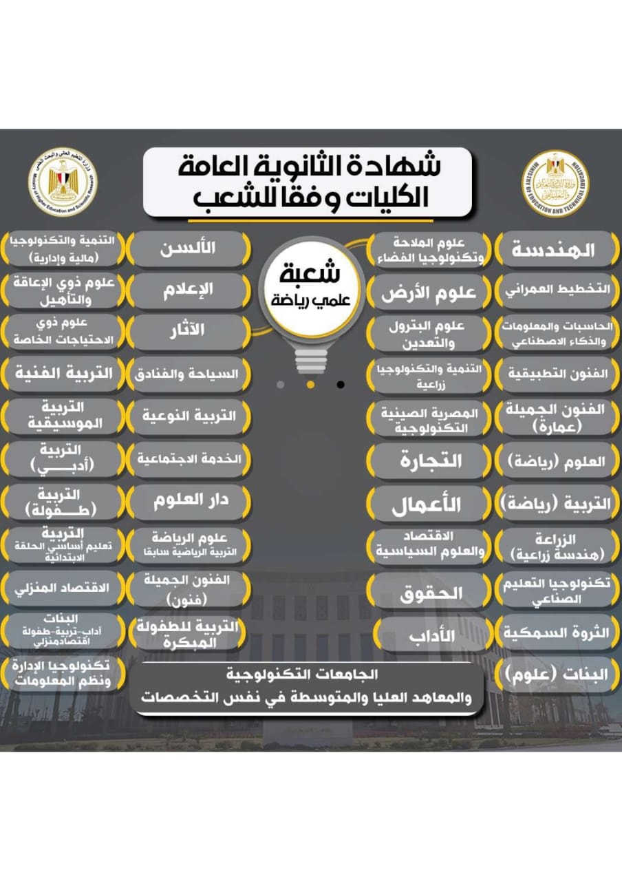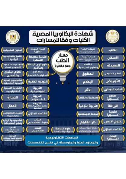 أعلنت وزارة التربية والتعليم والتعليم الفني ووزارة التعليم العالي والبحث العلمي اليوم، عن التفاصيل الكاملة للكليات والتخصصات الجامعية المتاحة وفقًا للمسارات المختلفة ضمن نظام البكالوريا الجديد، إلى جانب التخصصات الجامعية المتوفرة للطلاب في الشعب المختلفة بنظام الثانوية العامة التقليدي.