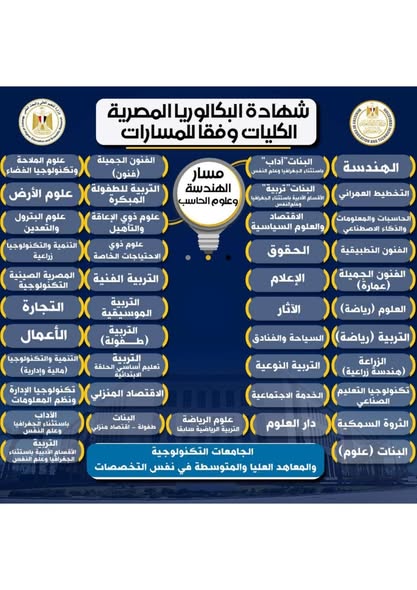 أعلنت وزارة التربية والتعليم والتعليم الفني ووزارة التعليم العالي والبحث العلمي عن الخريطة الكاملة للكليات والتخصصات الجامعية المتاحة، وذلك لكل من:
