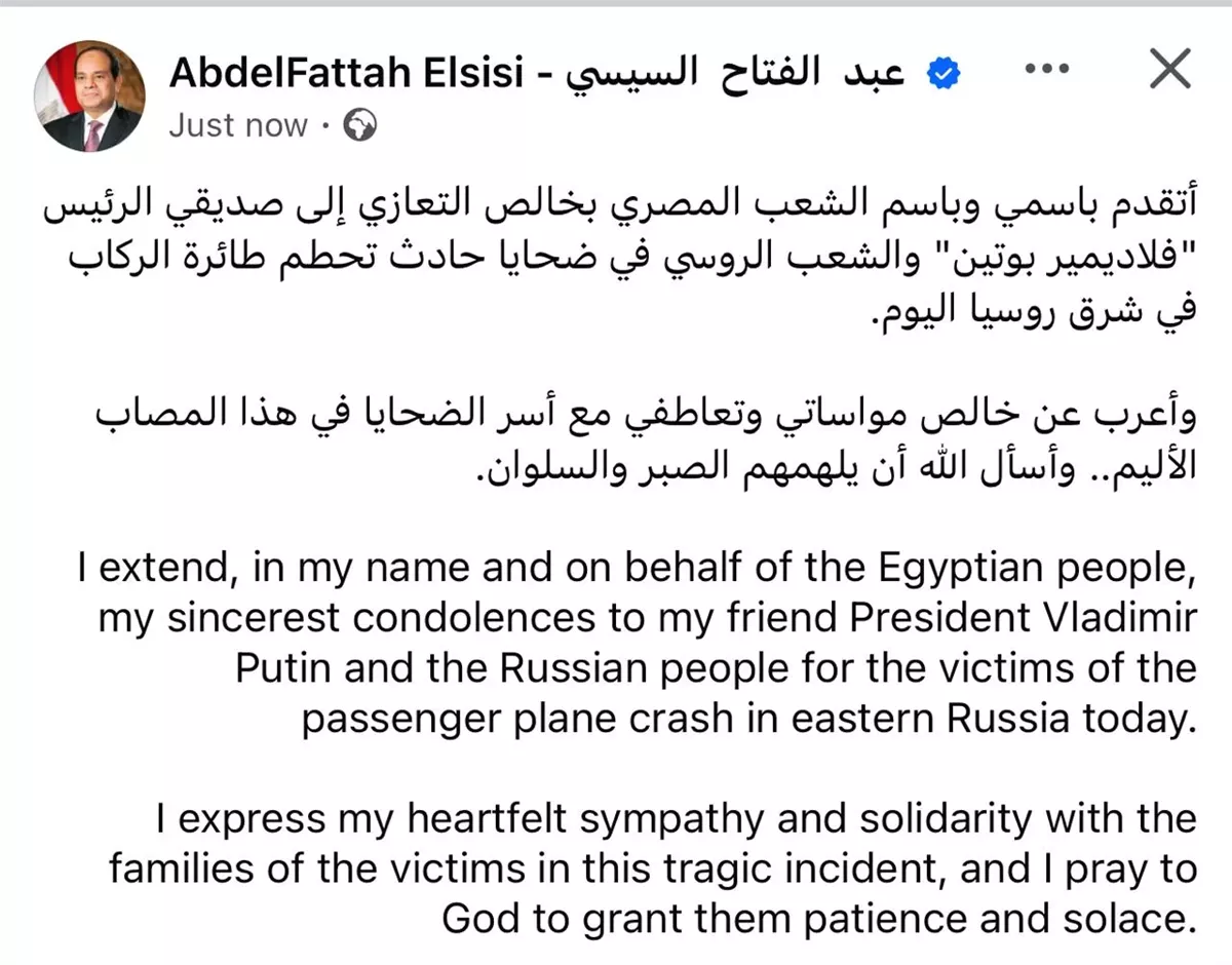 وأكد الرئيس، في بيان رسمي نُشر عبر حساباته على مواقع التواصل الاجتماعي، قائلًا: "أتقدم باسمي وباسم الشعب المصري بخالص التعازي إلى صديقي الرئيس فلاديمير بوتين، وللشعب الروسي، في ضحايا حادث تحطم طائرة الركاب في شرق روسيا اليوم".