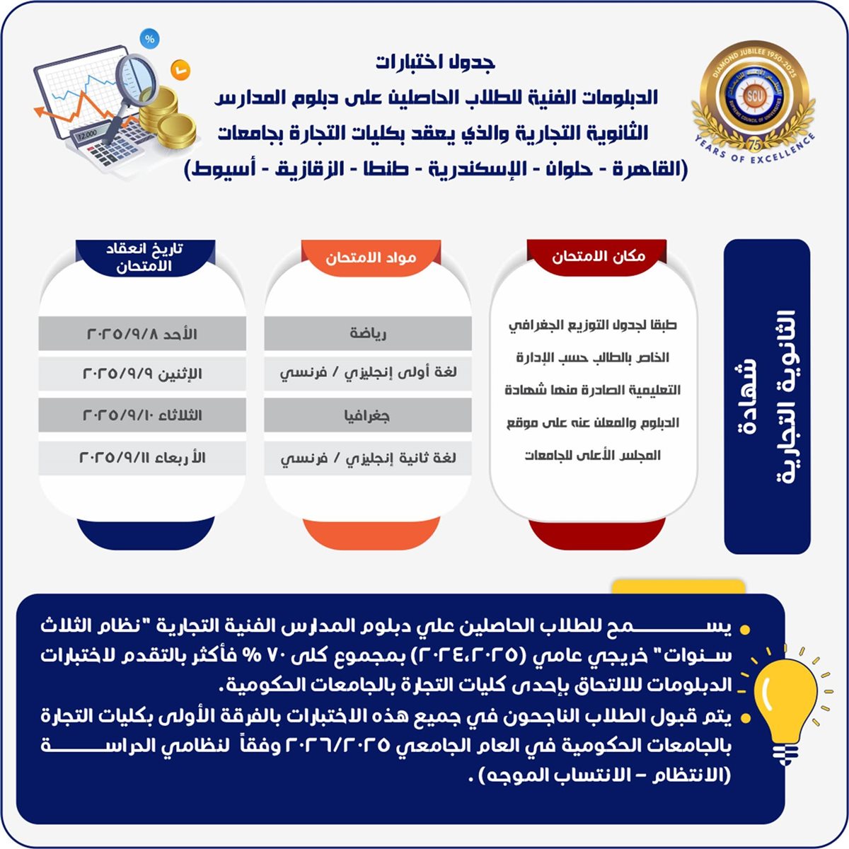 2025/2026 للطلاب الحاصلين علي الشهادات الفنية (نظامي الثلاث والخمس سنوات والمعاهد الفنية السنتين) وفقًا للشروط والقواعد للقبول بكليات التجارة وذلك من اعتبارًا من يوم الجمعة الموافق 1/8/2025 على أن يتم غلق الموقع الالكتروني قبل موعد الامتحانات بخمس أيام وفقًا لجداول الاختبارات المعلنة.