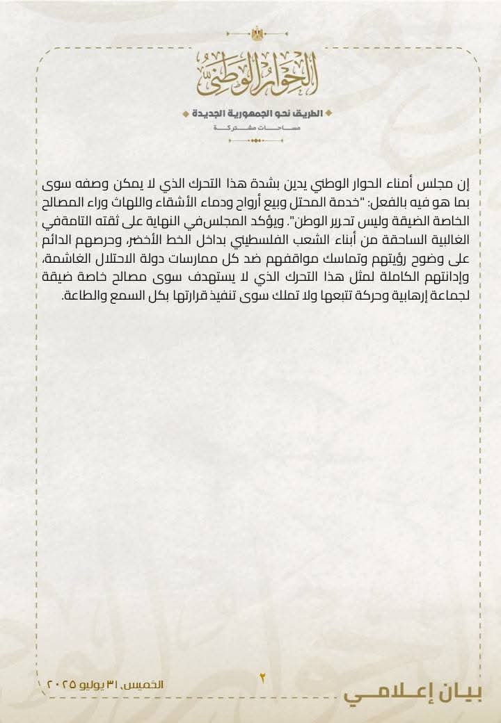 إن مجلس أمناء الحوار الوطني يدين بشدة هذا التحرك الذي لا يمكن وصفه سوى بما هو فيه بالفعل: "خدمة المحتل وبيع أرواح ودماء الأشقاء واللهاث وراء المصالح الخاصة الضيقة وليس تحرير الوطن". ويؤكد المجلس في النهاية على ثقته التامة في الغالبية الساحقة من أبناء الشعب الفلسطيني بداخل الخط الأخضر، وحرصهم الدائم على وضوح رؤيتهم وتماسك مواقفهم ضد كل ممارسات دولة الاحتلال الغاشمة، وإدانتهم الكاملة لمثل هذا التحرك الذي لا يستهدف سوى مصالح خاصة ضيقة لجماعة إرهابية وحركة تتبعها ولا تملك سوى تنفيذ قرارتها بكل السمع والطاعة.
