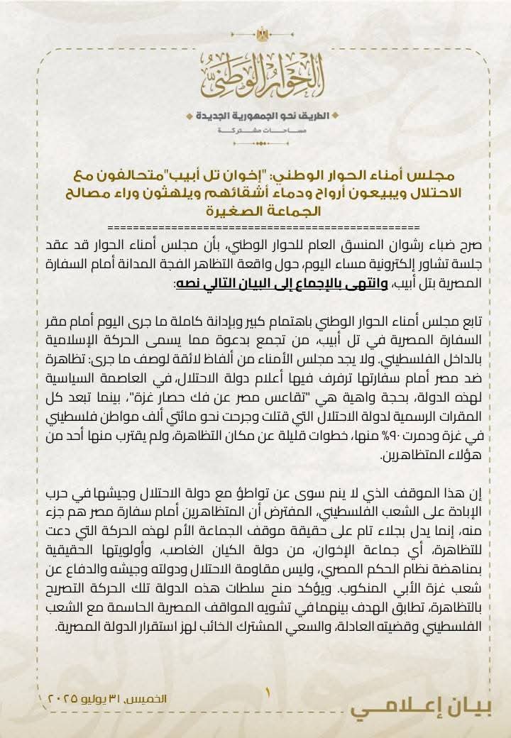 مجلس أمناء الحوار الوطني: "إخوان تل أبيب" متحالفون مع الاحتلال