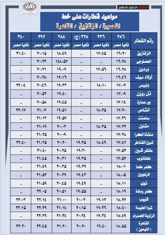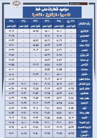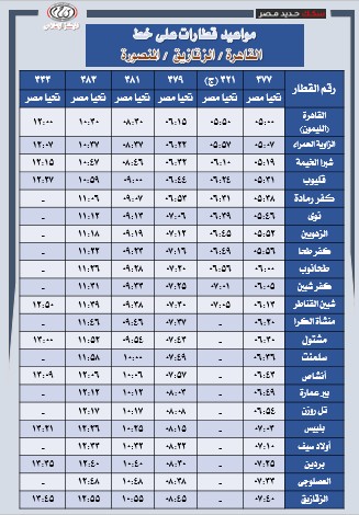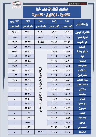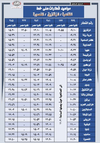تُعلن الهيئة القومية لسكك حديد مصر عن جدول تشغيل قطارات خط (القاهرة – الزقازيق – المنصورة) والعكس، وذلك بواقع 48 رحلة يوميًا (ذهابًا وإيابًا)، موزعة على عدة مستويات من الخدمة لتوفير خدمة اقتصادية مخفضة مخصصة للرحلات اليومية ذات الكثافة التشغيلية المرتفعة.