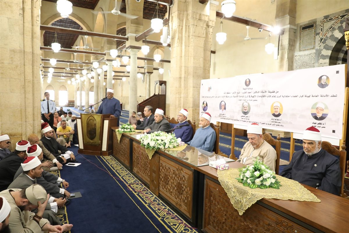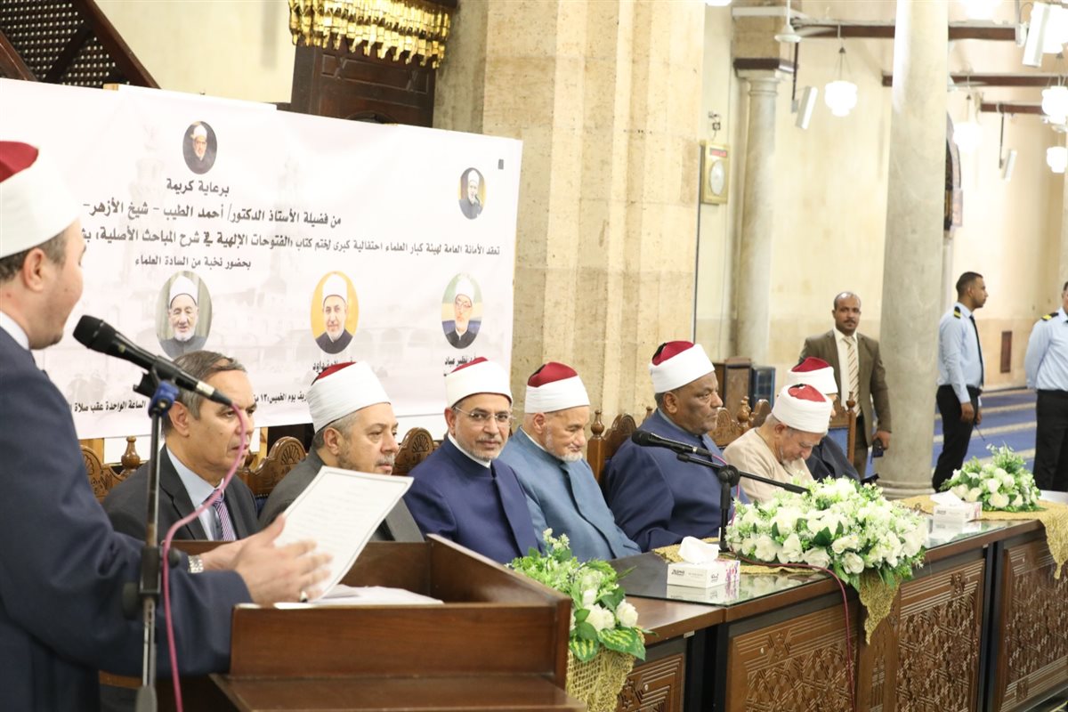 برعاية الدكتور أحمد الطيب، شيخ الأزهر، عقدت الأمانة العامة لهيئة كبار العلماء بالأزهر احتفاليةً علميةً كبرى بالجامع الأزهر، بمناسبة ختم شرح كتاب «الفتوحات الإلهية في شرح المباحث الأصلية» للإمام العلّامة أحمد بن عجيبة الحسني، والذي تولى شرحه وإجازته الدكتور حسن الشافعي، عضو هيئة كبار العلماء بالأزهر الشريف، وذلك وسط حضور علمي رفيع، ضم نخبةً من علماء الأزهر وطلابه من مصر ومختلف دول العالم، في مشهدٍ يعكس استمرارية المدرسة الأزهرية في خدمة السُّنة النبوية وإحياء تقاليد المجالس العلمية. وقدَّم الحفل الدكتور علي شمس الدين، الباحث بالأمانة العامة لهيئة كبار العلماء.