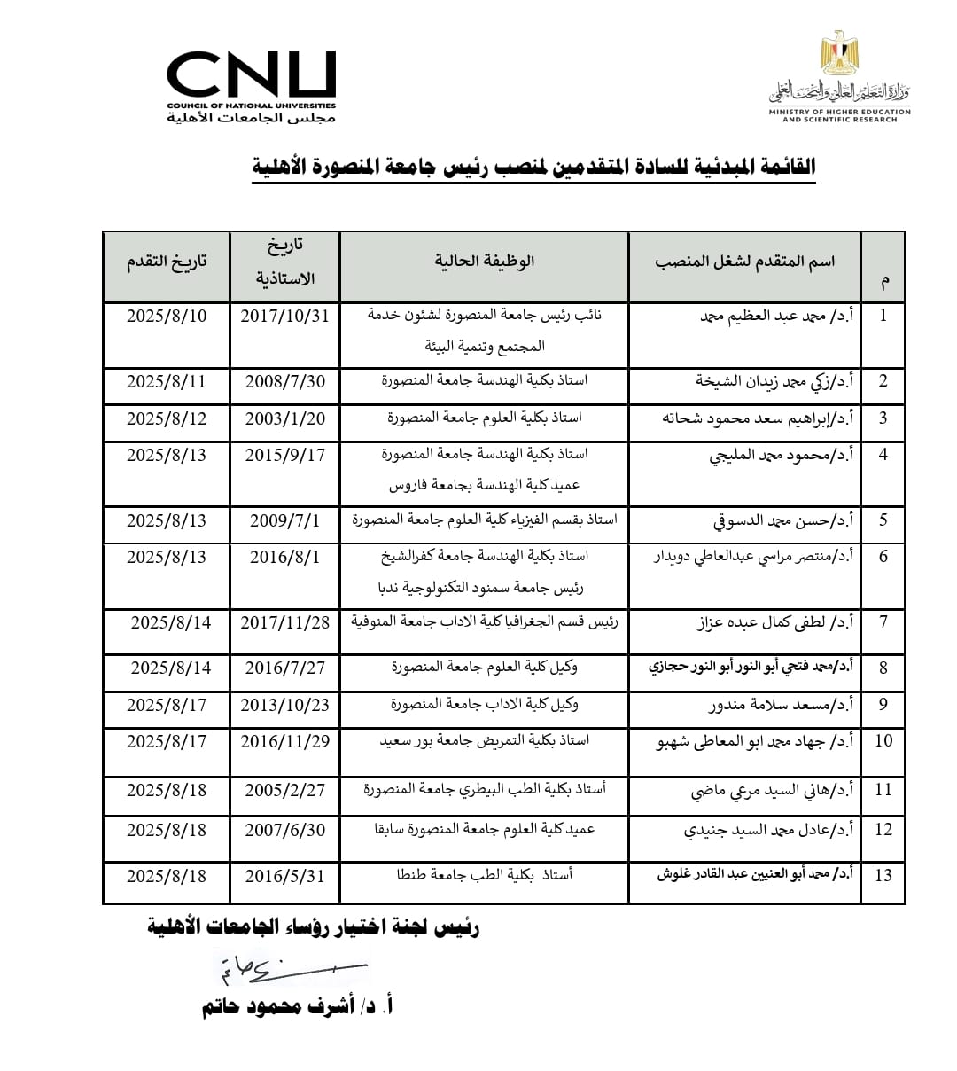 جامعة المنصورة الأهلية: 13 مرشحًا