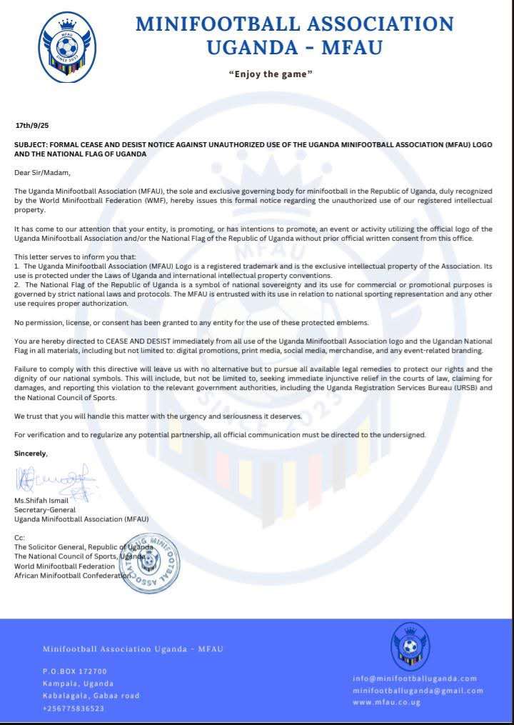 وعلى الجانب الاخر أرسل الاتحاد الأوغندي لكرة القدم المصغرة رسالة احتجاج رسمية إلى كل من الاتحاد الأفريقي والاتحاد الدولي لكرة القدم المصغرة (WMF ) وذكر في رسالته أن أحد الفرق المشاركة في البطولة يشارك باسم أوغندا دون الحصول على موافقته الرسمية.