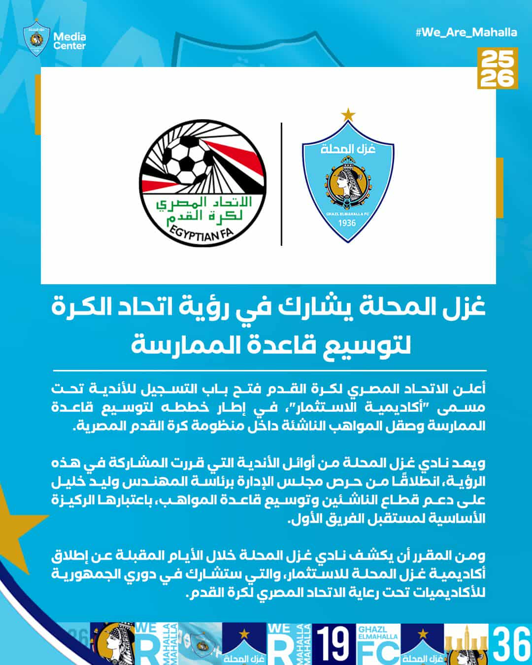 ويعد نادي غزل المحلة من أوائل الأندية التي قررت المشاركة في هذه الرؤية، انطلاقًا من حرص مجلس الإدارة برئاسة المهندس وليد خليل على دعم قطاع الناشئين وتوسيع قاعدة المواهب، باعتبارها الركيزة الأساسية لمستقبل الفريق الأول.