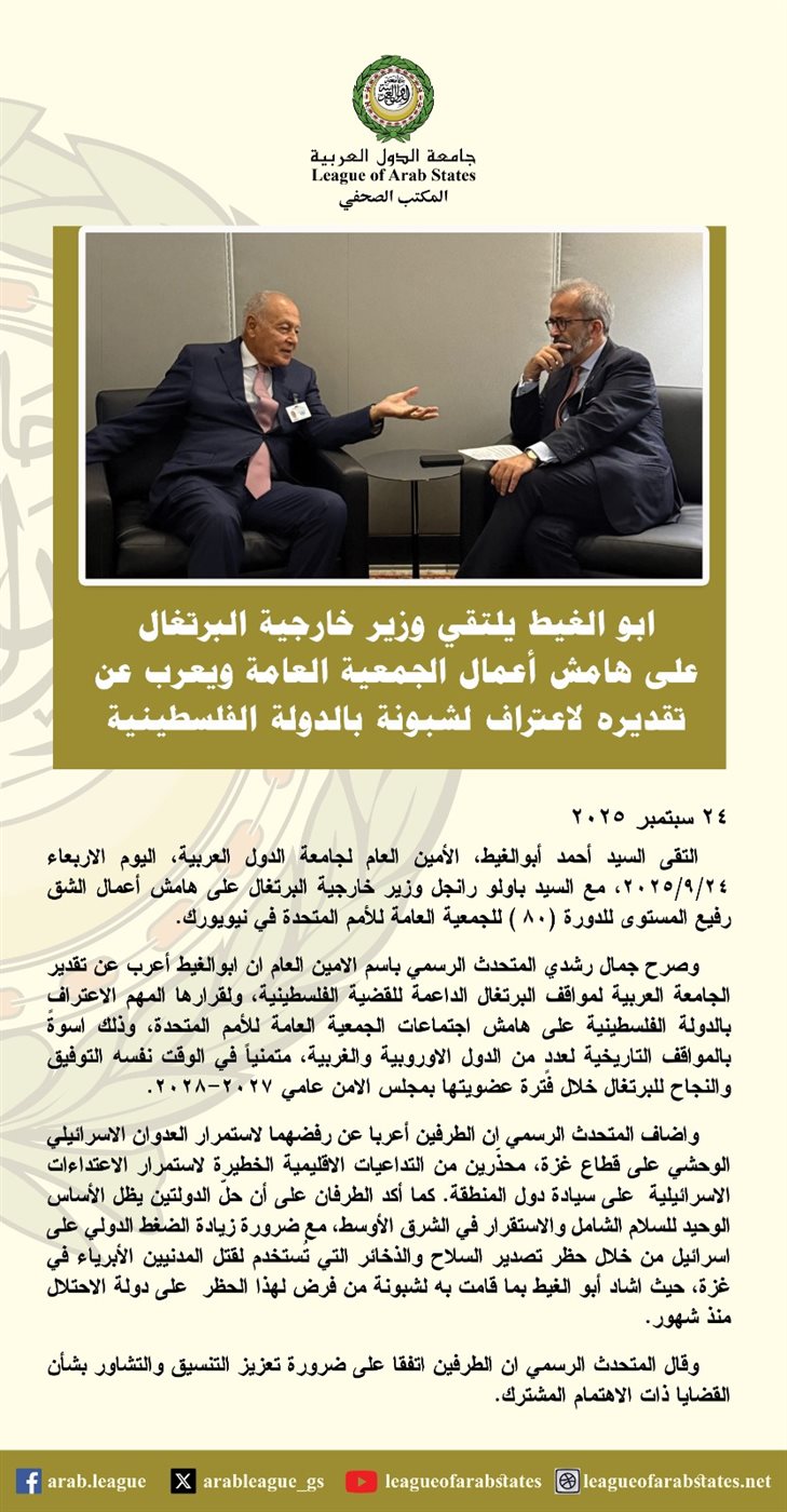 وأعرب أبو الغيط خلال اللقاء عن تقدير جامعة الدول العربية لموقف البرتغال الداعم للقضية الفلسطينية وقرارها المهم بالاعتراف بالدولة الفلسطينية.