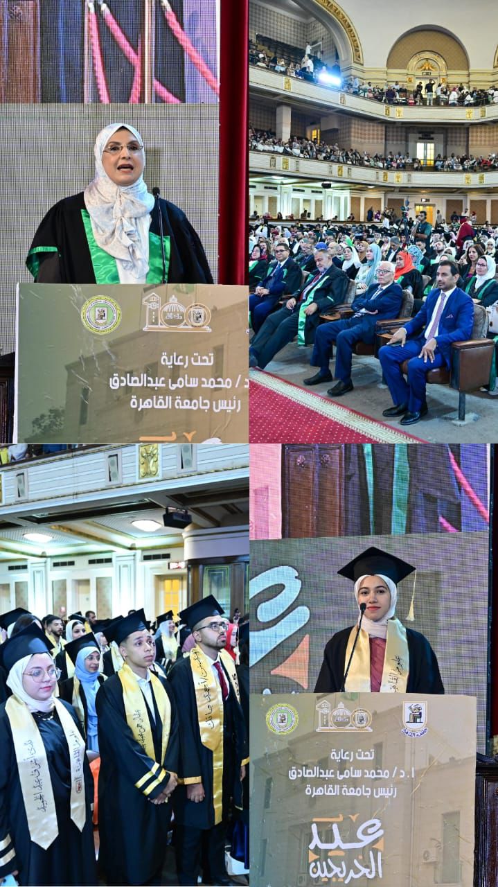 ومن جانبه، قدم الدكتور أحمد رجب نائب رئيس جامعة القاهرة لشئون التعليم والطلاب، التهنئة للخريجين خلال حفل تخرجهم والذي يُعد يوم الحصاد ويمثل لحظة فارقة في حياة الطلاب، ويأتي تتويجًا لجهودهم ورعاية أولياء أمورهم على مدار سنوات من العمل الدؤوب، مؤكدًا ضرورة أن يستمر الخريجون في استكمال دراستهم العُليا وأن يحرصوا علي التعلم وتطوير مهاراتهم الشخصية والمهنية للحفاظ على تميزهم، موجهًا الشكر لأساتذة الكلية الذين لم يبخلوا بعلمهم وجهدهم على الطلاب، كما وجه الشكر لأولياء الأمور الذين ضحوا كثيرًا من أجل أن يستكمل أبناؤهم الدراسة الجامعية.